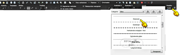 Met de pijl van links naar rechts breedte op 40